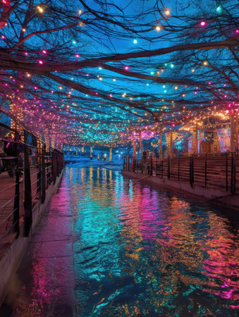 Colorful lights illuminate a serene canal in the evening, creating a festive ambiance with vibrant reflections on the water surface and trees above.