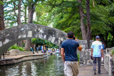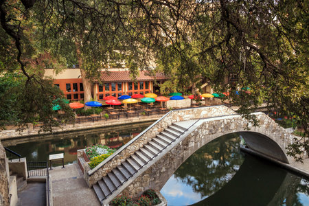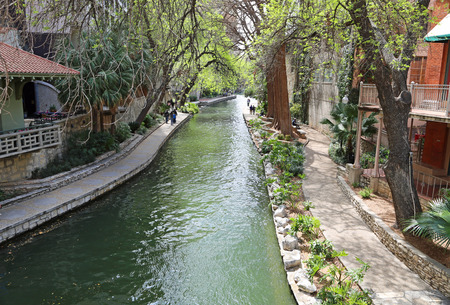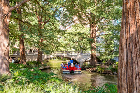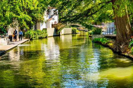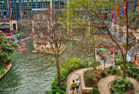 Colorful view of a tree lined section of the landmark San Antonio River Walk in San Antonio, Texas. People enjoying a lazy summer afternoon among a verdant oasis of cypress-lined paved paths, arched stone bridges and lush landscapes as the river gently winds through the city center.