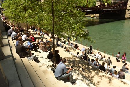 Chicago, USA - June, 2018: People on the Chicago Riverwalk in downtown of Chicago.