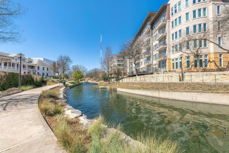 Small river in the middle of mid-rise resiedntial buildings at San Antonio, TX. There is a concrete walkway on the left side of the river and view of a tower at the back of the building on the right.