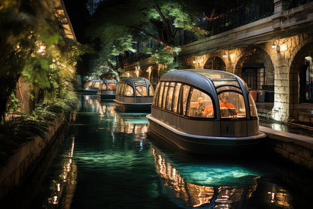 San Antonio River Walk and boat with light near La Villita in downtown San Antonio, Texas, TX, USA.