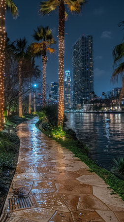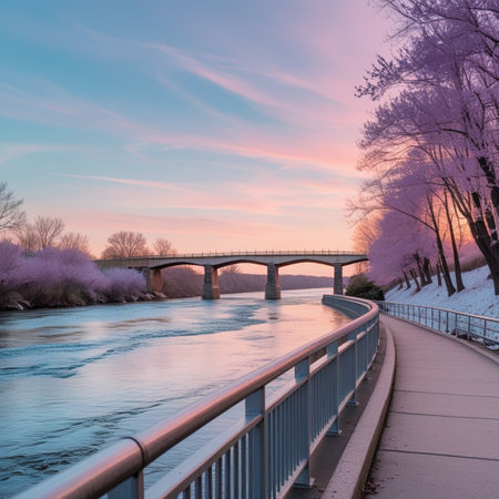 An illustrated cityscape depicts a river scene at dusk with lights reflecting on the water. A park with decorative shrubs and flower beds borders the waterway. Figures stroll along the paths. The image could be used for editorial content or as a backdrop in commercial projects.