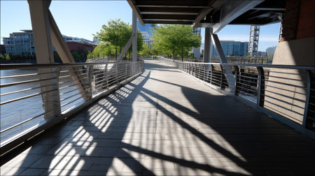 A beautiful modern walkway featuring rich wooden textures, casting dynamic shadows over water. Surrounded by lush green trees and a clear blue sky, this scene captures urban tranquility.