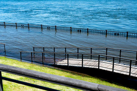A flooded pedestrian overpass on the river embankment. The rise in the water level when discharged to the hydroelectric power station.