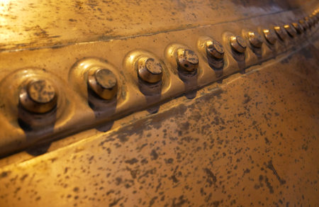 This image showcases a close-up view of a weathered metal surface featuring rivets, highlighting intricate textures ideal for design, industrial themes, or backgrounds.