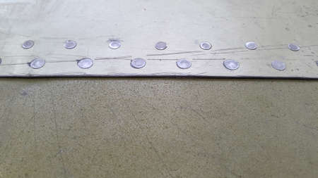 Riveting two pieces of metal sheet. Connecting steel with rivets. Dark background.