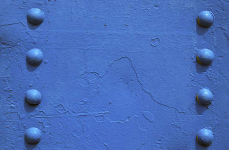 This image showcases a close-up view of a blue metal surface adorned with rivets and bolts, ideal for industrial-themed design projects or backgrounds.