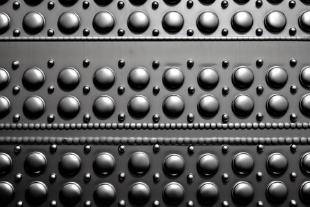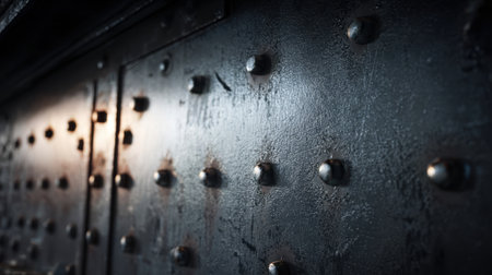 A close-up view of a textured metal panel decorated with rivets, offering a sleek industrial aesthetic ideal for backgrounds in design projects.