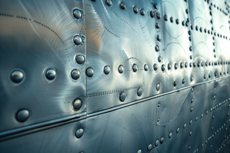 Riveted aluminum panels on an airplane fuselage showcasing industrial design with sunlight reflections. highlighting the texture, craftsmanship, and durability of aviation materials, this image is ideal for aviation, engineering, and design themes.