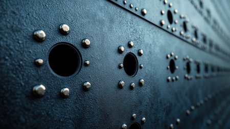 Close up of a dark metallic surface with rivets and soft circular cutouts.