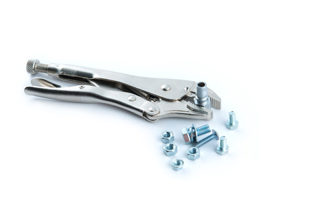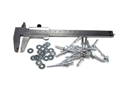 Close up of red riveting pliers for setting blind rivets and joining sheet metal in sheet metal work and aircraft construction next to silver rivets on white background