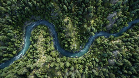 This scene showcases a stunning winding river flowing through a vibrant green forest. The water reflects the clear sky, enhancing the tranquil beauty of this untouched nature spot.