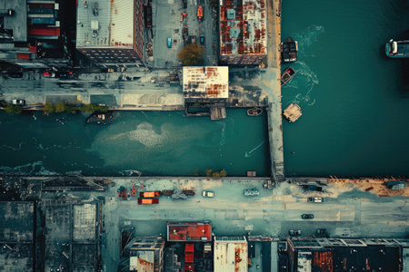 Aerial view of cargo ship in harbor. Cargo ship in port