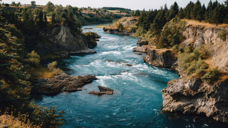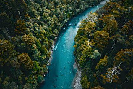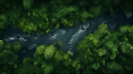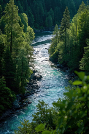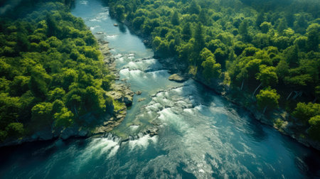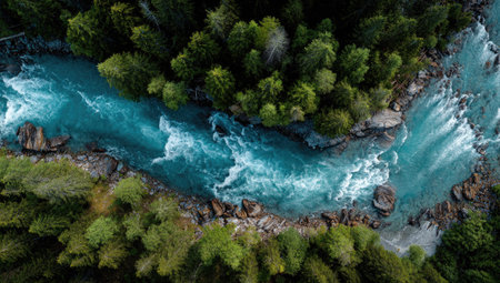 An aerial perspective showcases a river's powerful flow amidst a dense forest. The turquoise water contrasts with the green foliage, creating a dynamic composition. Overhead lighting illuminates the textures of the water and trees. Ideal for illustrating environmental themes and natural beauty, the image suits various editorial or commercial applications.