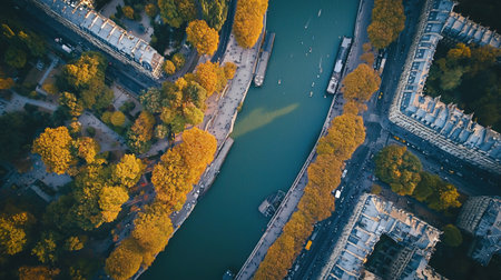 An aerial shot of the Seine River in Paris, France, showcasing the vibrant autumn colors along the riverbanks and surrounding buildings.