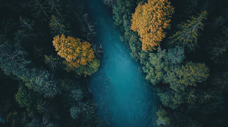 An aerial shot showcasing a river meandering through a dense forest, with trees displaying autumn colors.