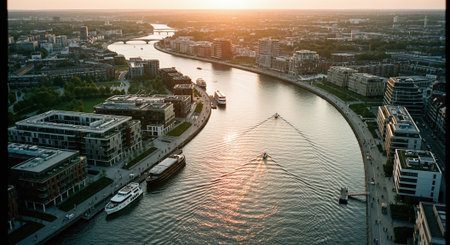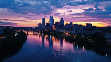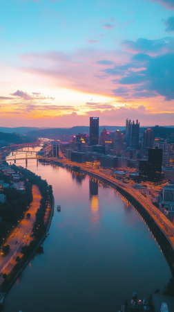 As dusk settles over the city, lights illuminate the skyline and reflect on the tranquil river below. The urban landscape exudes energy as day transitions to night.