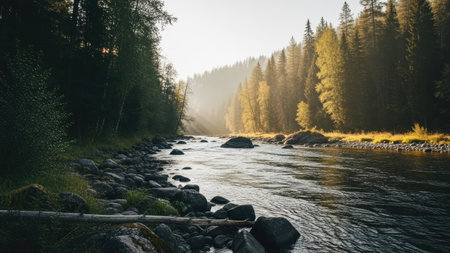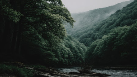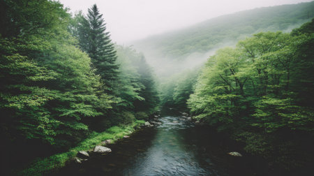 river flowing over moss-covered rocks, surrounded by misty trees, creates a serene and romantic riverscape. the light gray and dark emerald tones add a touch of elegance to this outdoor scene, reminiscent of the works of aleksandr deyneka. the mountainous vistas and calming symmetry further enhance the beauty of this agfa vista photograph. ai generated