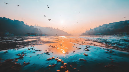 A breathtaking view of a calm river during a misty sunrise. The warm sun reflects in orange on the teal water, with birds flying overhead and silhouetted hills in the background.
