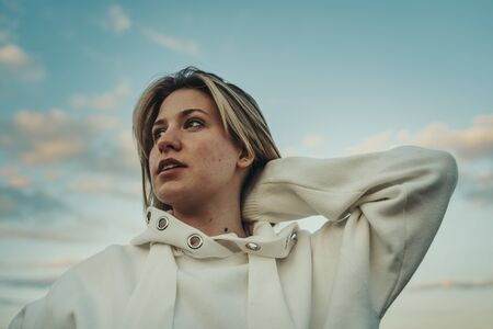 Blonde cute girl in nature landscape with orange and green sky.