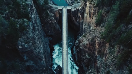 A breathtaking aerial perspective showcases a narrow bridge connecting two rocky cliffs above a swift river. The vibrant blue water contrasts with the earthy tones of the canyon walls.