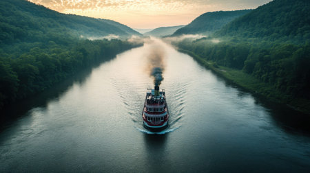 A stunning steamboat glides through a tranquil river surrounded by misty hills. This picturesque scene captures the peace of nature during a serene sunrise.