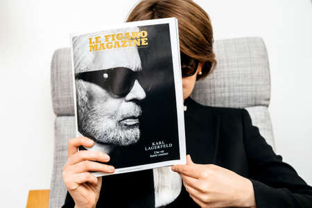 Paris, France - Feb 23, 2019: Woman reading French Le Figaro magazine covering Karl Lagerfeld death, iconic fashion designer died aged 85 Q and A with the fashion designer article
