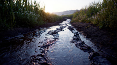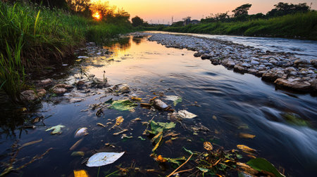 A Polluted river with toxic waste and debris at sunset