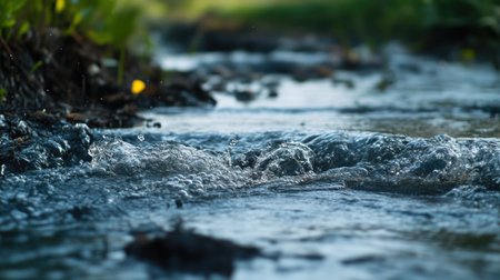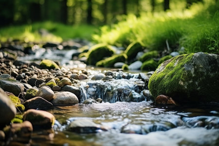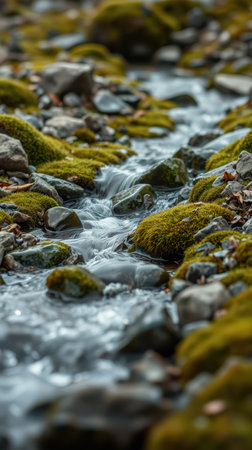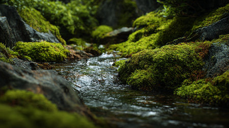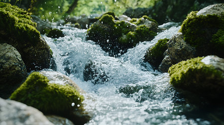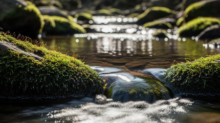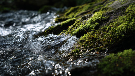 A tranquil stream flows gently over moss-covered rocks, creating a serene and refreshing atmosphere. The sparkling water reflects sunlight, highlighting nature's beauty.