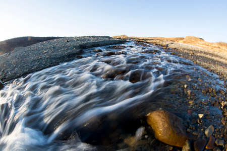 Small water stream flowing through sand on the beach, shallow depth of field