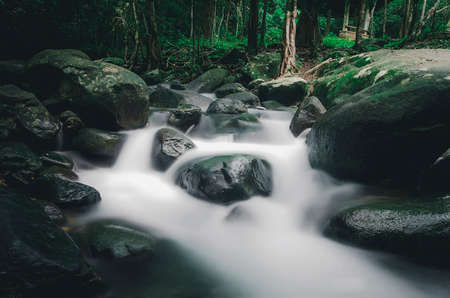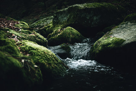 Mossy rocks and water stream in the forest. Nature.