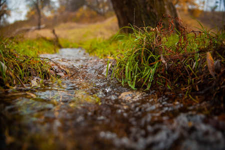 Small creek flowing in the forest through fallen leaves