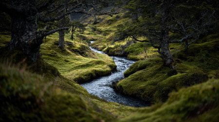 This tranquil image captures the beauty of a winding stream flowing through a lush green landscape, framed by trees, creating a serene forest scene.