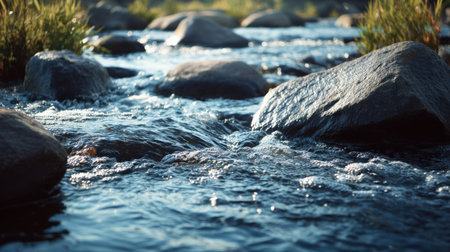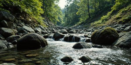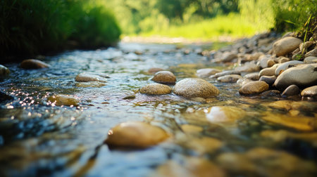 A peaceful stream winds through a bed of smooth, rounded stones, creating a serene atmosphere. Sunlight glimmers off the water, capturing the beauty of nature's untouched landscape.