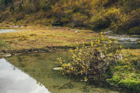 Scenic nature background with wild mountain flora in gold autumn colors. Yellow leaves above water stream in sunlight. Golden autumn flora in mountains. Nature backdrop with yellow foliage close-up.