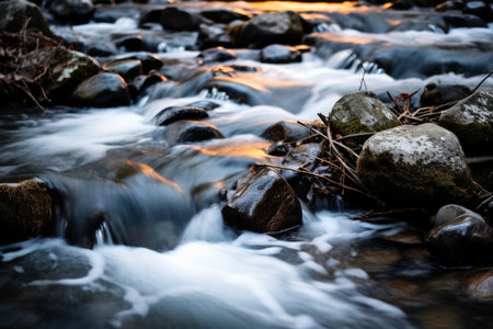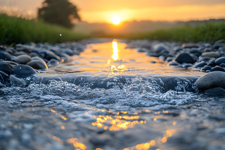 A serene sunrise illuminates a flowing pebbled stream with golden reflections, creating a tranquil, nature-inspired scene. the warm glow of the sun and the calm water evoke peace and harmony, perfect for nature-themed designs. Generative AI