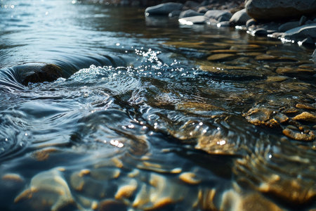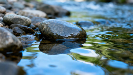 Close-up of clear water flowing gently over smooth stones in a serene stream, with sunlight glistening on the surface