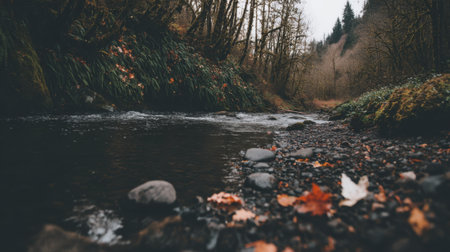 Low angle view of a shallow forest stream with autumn leaves and mossy rocks in a moody natural landscape