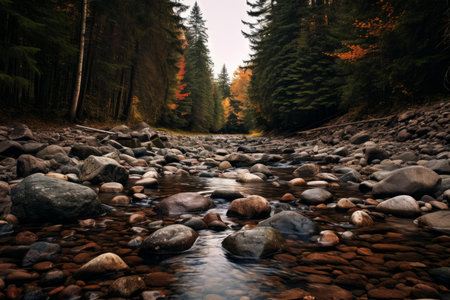 A river flowing through a forest with rocks and trees, AI
