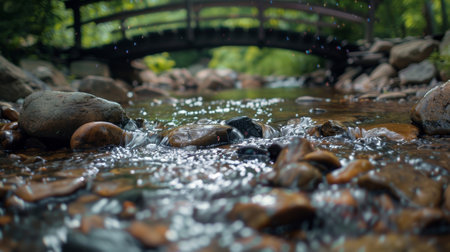 This captivating image showcases water splashing over rugged rocks in a serene stream, highlighting the beauty of nature and the tranquility of flowing water.