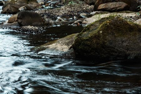 Mossy stones and small river in the forest. Shallow depth of field.
