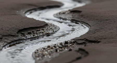 A small stream of clear water meanders in a gentle 'S' curve through dark, wet sand, with tiny pebbles lining its banks. This minimalist, close-up photograph captures the serene and simple beauty of water flowing in nature.