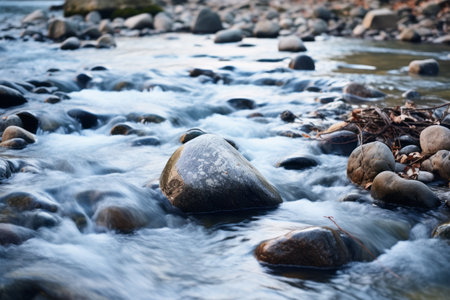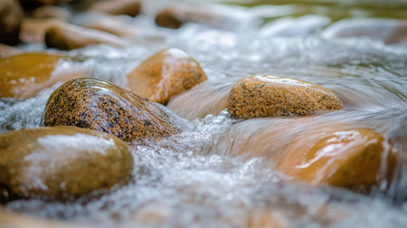 A close-up of rounded stones in a river, with water gently lapping against them, creating a peaceful and natural scene perfect for outdoor photography