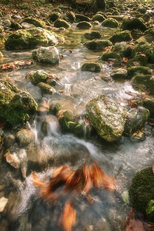 Little stream into the forest. Water effect with long exposure. There are many rocks covered with moss and some trees and dry branches.