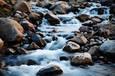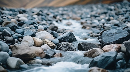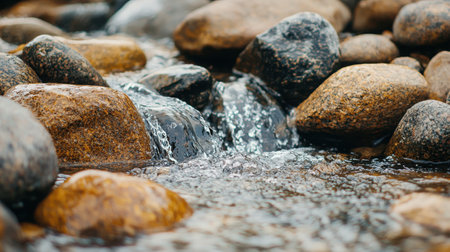 A close-up view of a serene stream meandering over various sized pebbles, capturing the peaceful essence of nature's beauty and tranquility.