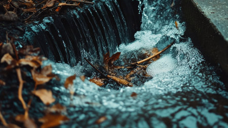 Stormwater gushing out of an overfilled drain, carrying leaves and sticks in a powerful, swirling current