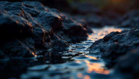 Tranquil stream flowing between dark rocks at sunset