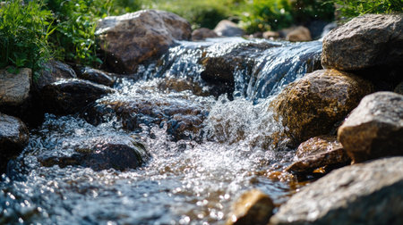 A serene stream flowing gently over stones, framed by lush greenery and illuminated by bright sunlight, creating a tranquil atmosphere perfect for nature lovers.