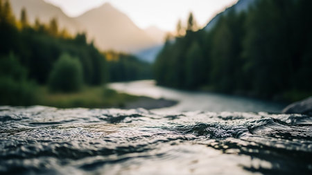 Detailed view of water flowing in a river with a soft focus on a distant mountain range and forest at sunset.