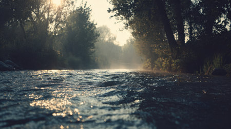 A peaceful morning scene depicting a serene river surrounded by trees, with mist rising off the water's surface, creating a tranquil and enchanting atmosphere.